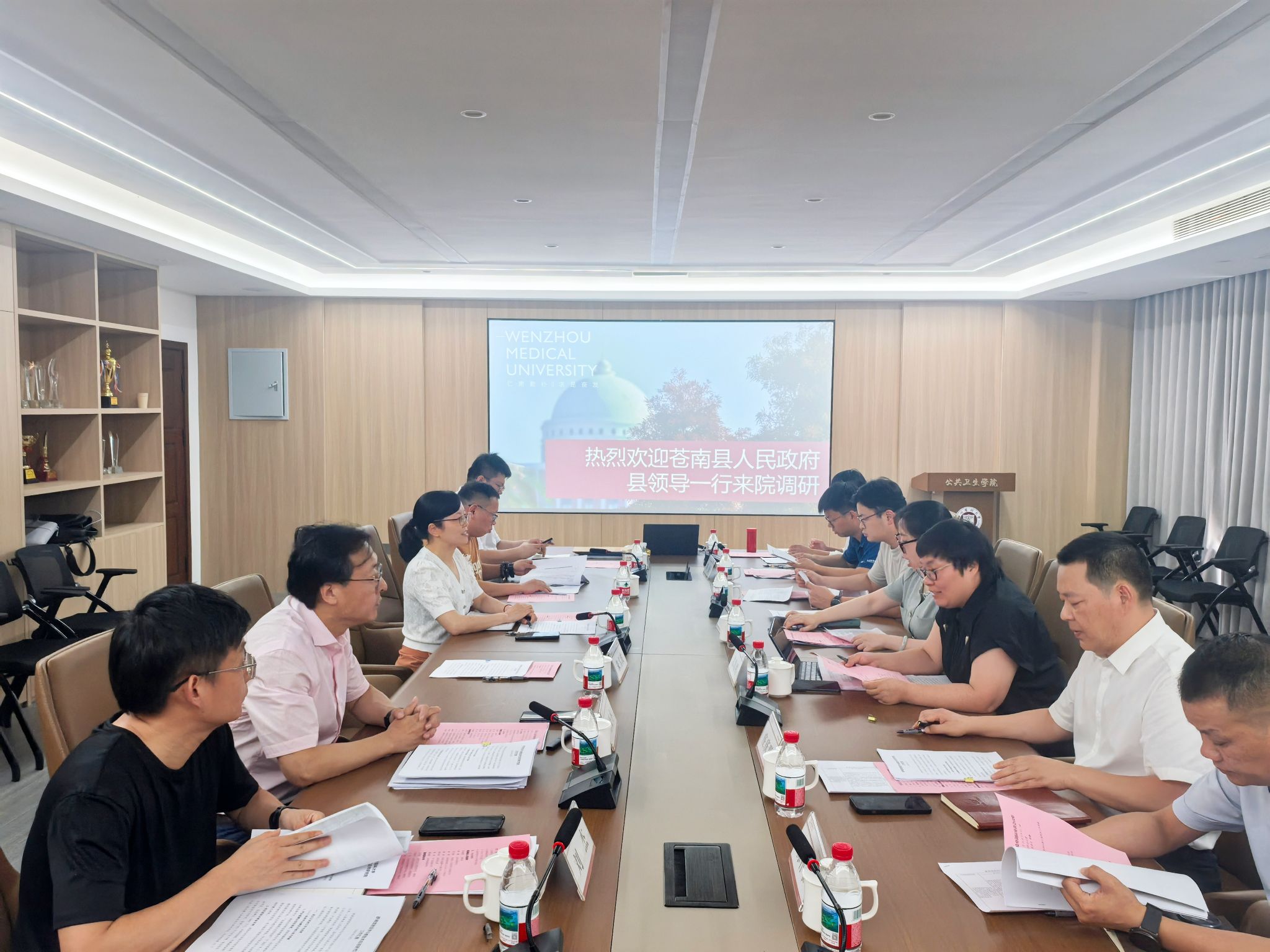 2025年6月26日下午,苍南县人民政府领导苏海鸥率调研组一行11人莅临杏吧 ,就深化校地合作事宜,专程拜访杏吧 李校堃院士并调研杏吧 。杏吧 院长刘晓冬、党委书记王芳,发展规划处(校地合作处)副处长刘杰及浙南放射医学与核技术应用研究院相关负责人出席调研会议。