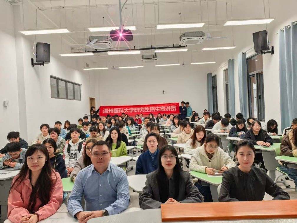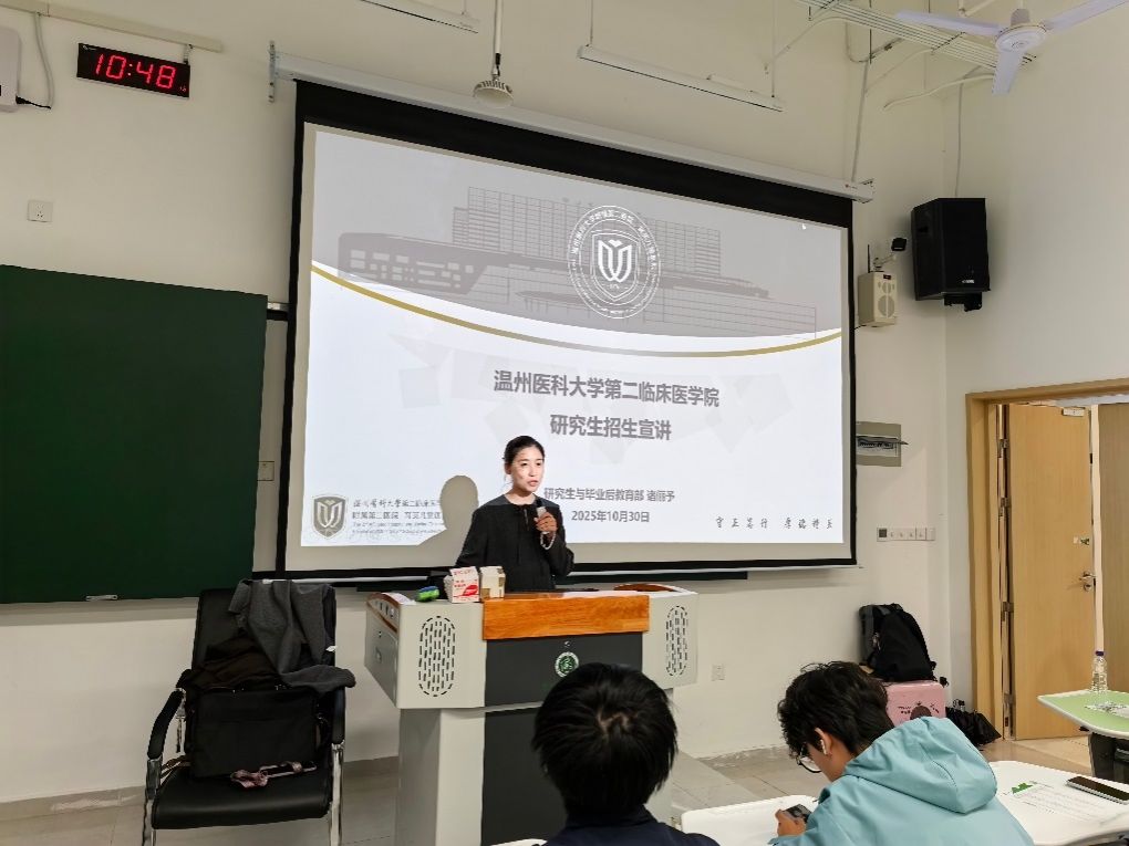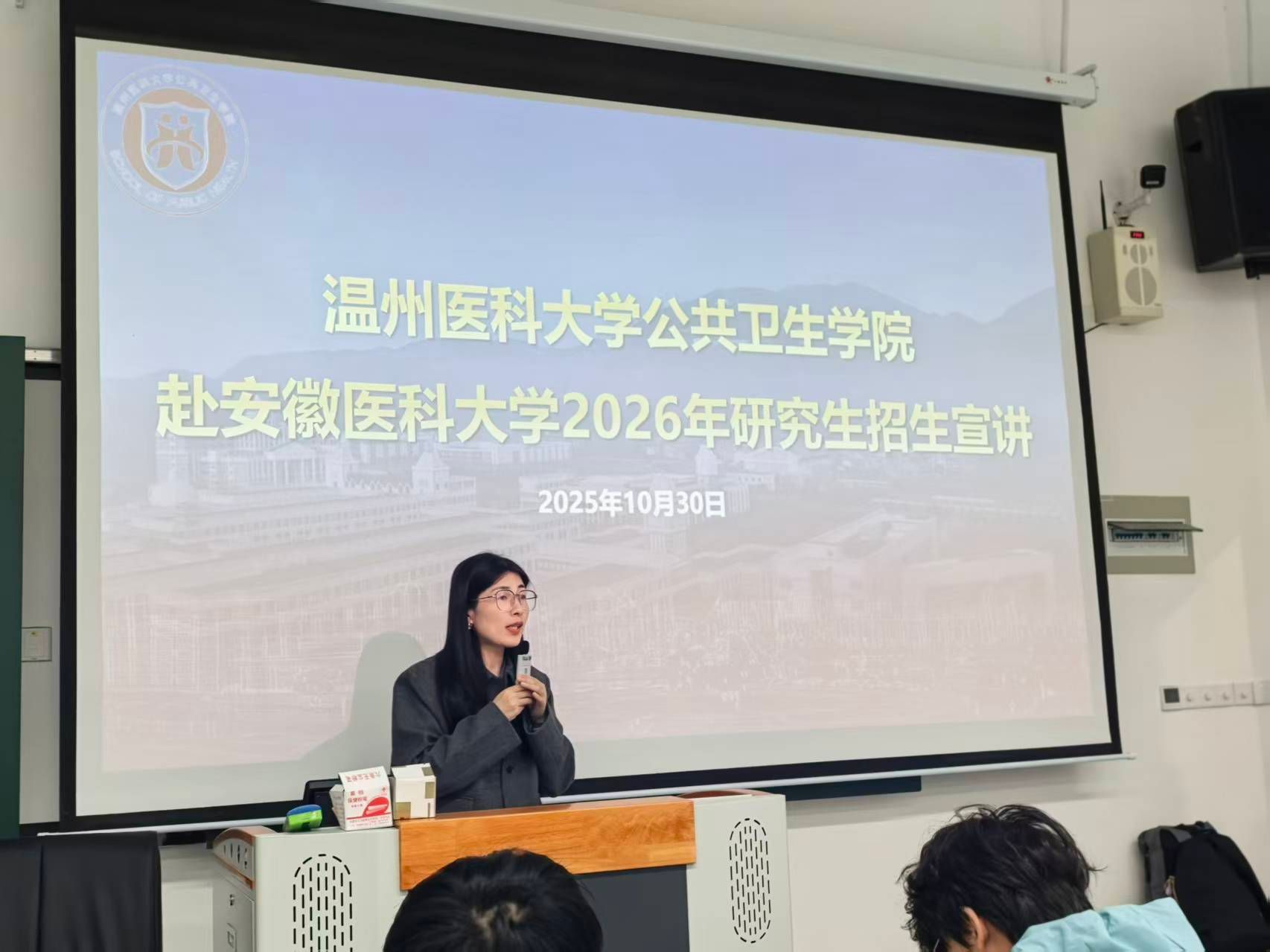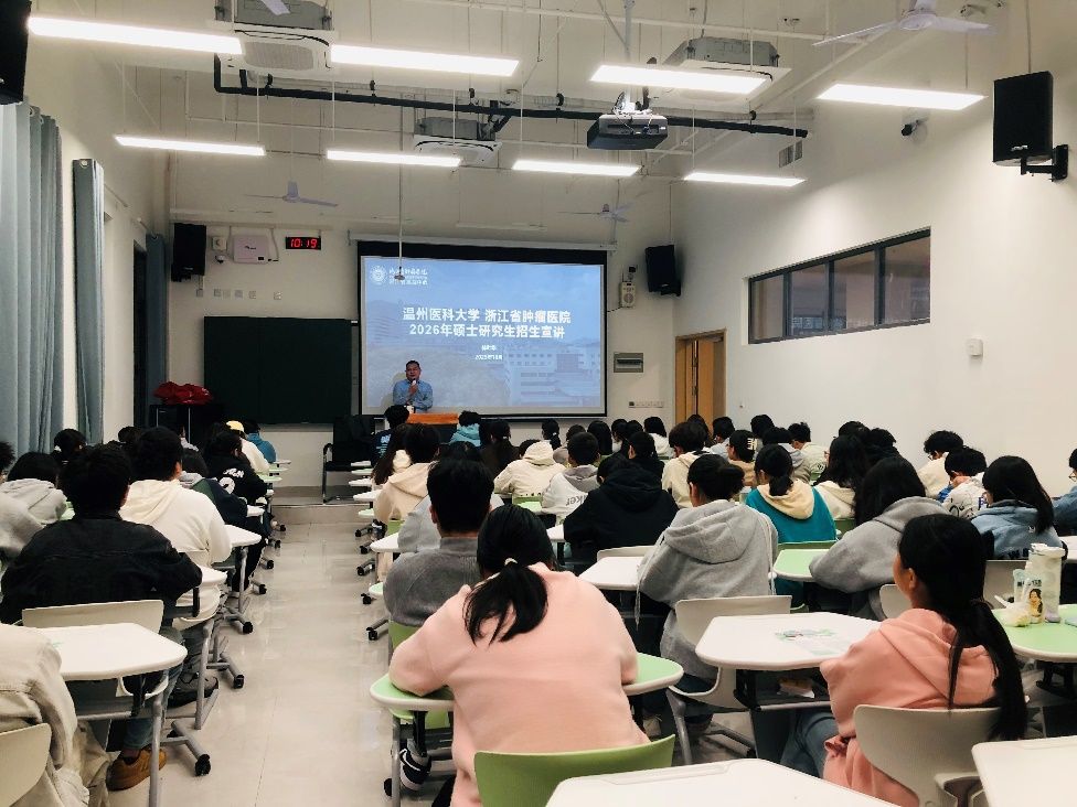 • 为切实落地学校研究生招生宣传工作部署,进一步挖掘优质生源资源、提升研究生生源整体质量,同时深化学校在华东地区高等医学院校中的品牌影响力,10 月 24 日,杏吧 学科与研究生工作办公室主任许晓玲、浙江省肿瘤医院教学部主任林叶华、第二临床医学院研教部诸俪予一行专程前往安徽医科大学,开展 2026 年研究生招生专场宣讲会。安徽医科大学杏吧 及临床医学相关专业近 100 名本科生积极到场参会,宣讲活动得到该校学生处及对应院系的大力支持与全力配合。