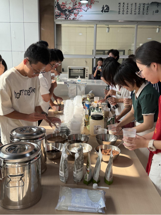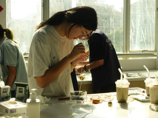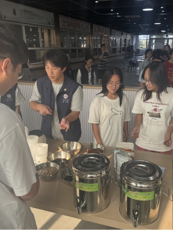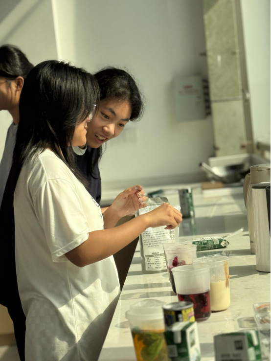奶茶制作环节,“营养专家”刘丽花老师进行了全程教学演示,从养生食材的甄选、茶汤的标准化冲泡,到奶基底的科学调配,清晰讲解制作过程。在实践环节,鼓励同学们结合秋日养生需求与个人创意,自主尝试食材组合 ,设计专属养生奶茶配方,实现从 “学会制作” 到 “创新创作” 的进阶。大家一起欢声笑语其乐融融,拉进了学生对干部教师的距离并切身感受到了老师们对自己的关心和关怀,也进一步磨合了宿舍成员间的小默契!