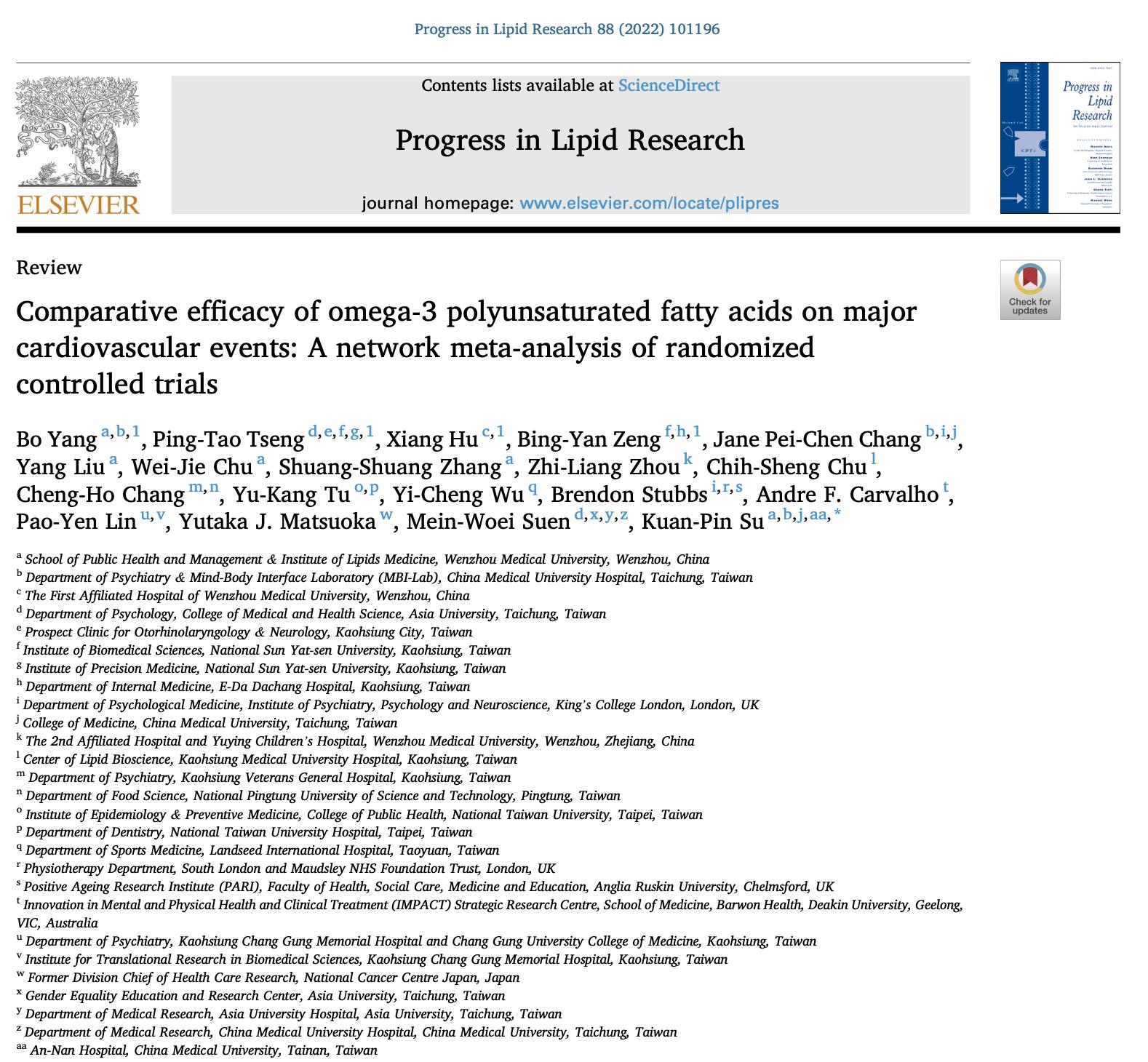 针对这个重大健康议题,我校公共卫生与管理学院杨波校聘研究员团队,联合台湾中国医药大学身心介面研究中心研究团队和多名国际脂质研究学者,在国际脂质医学顶级期刊《PROG LIPID RES》(5-year IF=17.40)发表题为“Comparative efficacy of omega-3 polyunsaturated fatty acids on major cardiovascular events: A network meta-analysis of randomized controlled trials”学术论文,校公共卫生与管理学院为第一作者和通讯作者第一单位:公共卫生与管理学院杨波研究员为第一作者,亚洲大学神经科诊所曾秉涛医师和附属第一医院内分泌科胡珦副主任医师为共同第一作者,国际知名营养医学专家、台湾中国医药大学身心介面研究中心主任、杏吧 脂类医学研究所外方所长苏冠宾教授为独立通讯作者。