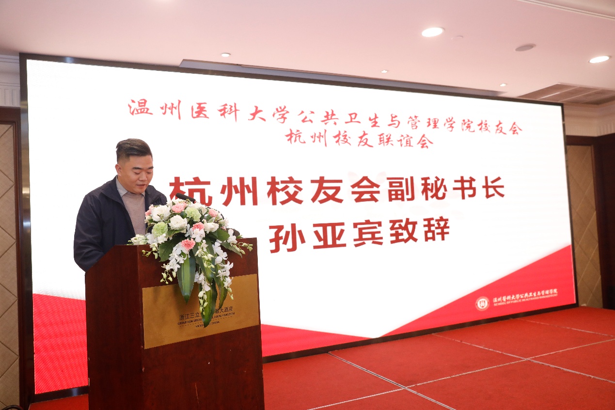 杭州校友会副秘书长孙亚宾对温医大公共卫生与管理学院杭州校友联谊会的成立表示衷心祝贺,他表示校友永远是母校最宝贵的财富和资源,是母校事业发展最可信赖的力量。希望各地区校友会加强交流与合作,凝聚力量服务社会。