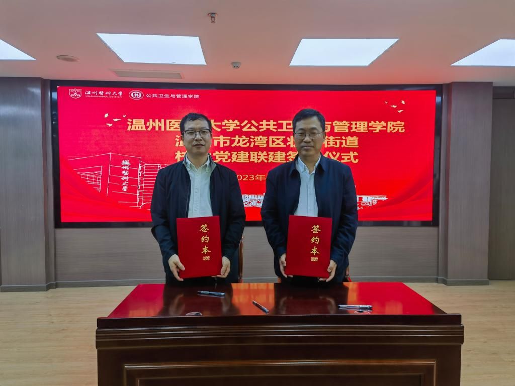 为深入开展学习贯彻习近平新时代中国特色社会主义思想主题教育,充分发挥党建示范引领作用,促进学院党建与公共健康志愿服务深度融合,4月27日上午,公共卫生与管理学院与状元街道在罗西社区党群服务中心举行党建联建签约仪式。学院党委书记马洪君,党委副书记季好,教工第三支部书记、预防医学系系主任毛广运,教工第五支部书记、预防医学系营养与食品卫生学教研室主任单毓娟,教工第六支部书记、放射医学系教师马淑梅,教工第四支部代表、环境信息地理学教研室教师纪晓亮,学工办主任滕杨杨;温州市龙湾区状元街道党工委书记孔德亮,党工委副书记、两新工委书记邵建龙,组织委员朱建伟以及罗西片区社区、经合社书记出席本次会议。会议由邵建龙主持。