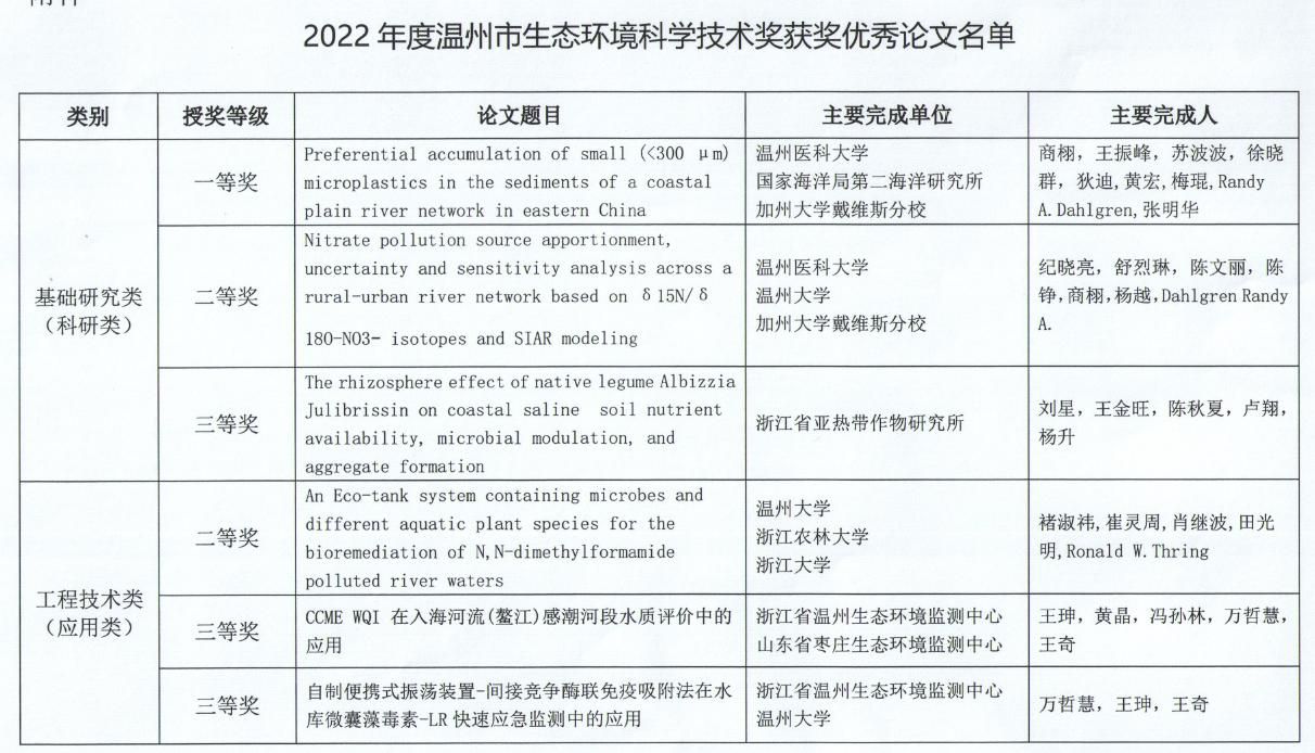 近日,2022年温州市生态环境科学技术奖(优秀论文奖)获奖名单公布。我校作为第一单位喜获2项温州市生态环境科学技术奖,其中一等奖1项,二等奖1项。