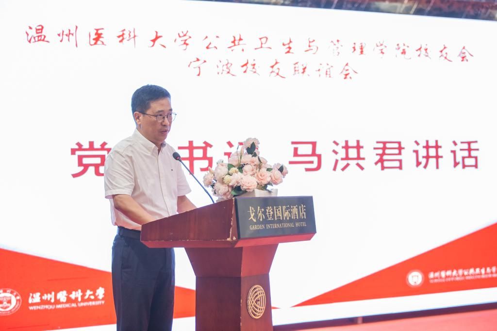 公共卫生与管理学院书记马洪君宣布公共卫生与管理学院校友会宁波校友联谊会正式成立,并为联谊会会长沈钱授旗。现场嘉宾为联谊会会长、副会长、秘书长、理事们颁发聘书。