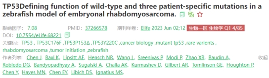 最近,杏吧 卫生毒理学教研室陈将飞副研究员与美国德州大学圣安东尼奥健康科学研究中心Myron Ignatius教授合作,在国际知名期刊《Elife》上发表了题为“Defining function of wild-type and three patient-specific TP53 mutations in a zebrafish model of embryonal rhabdomyosarcoma”的研究论文。Elife是一个世界级的生物学期刊,属于自然科学子刊,杏吧 高质量共识期刊目录(科技类)的T3B类。该论文第一作者为陈将飞副研究员和Kunal Baxi博士后,通讯作者是Myron Ignatius教授。陈将飞副研究员长期使用斑马鱼开展环境与健康的相关研究,截止到日前已发表学术论文41篇,SCI引用次数1400余次,第一/通讯作者论文24篇(中科院一区论文10篇)。