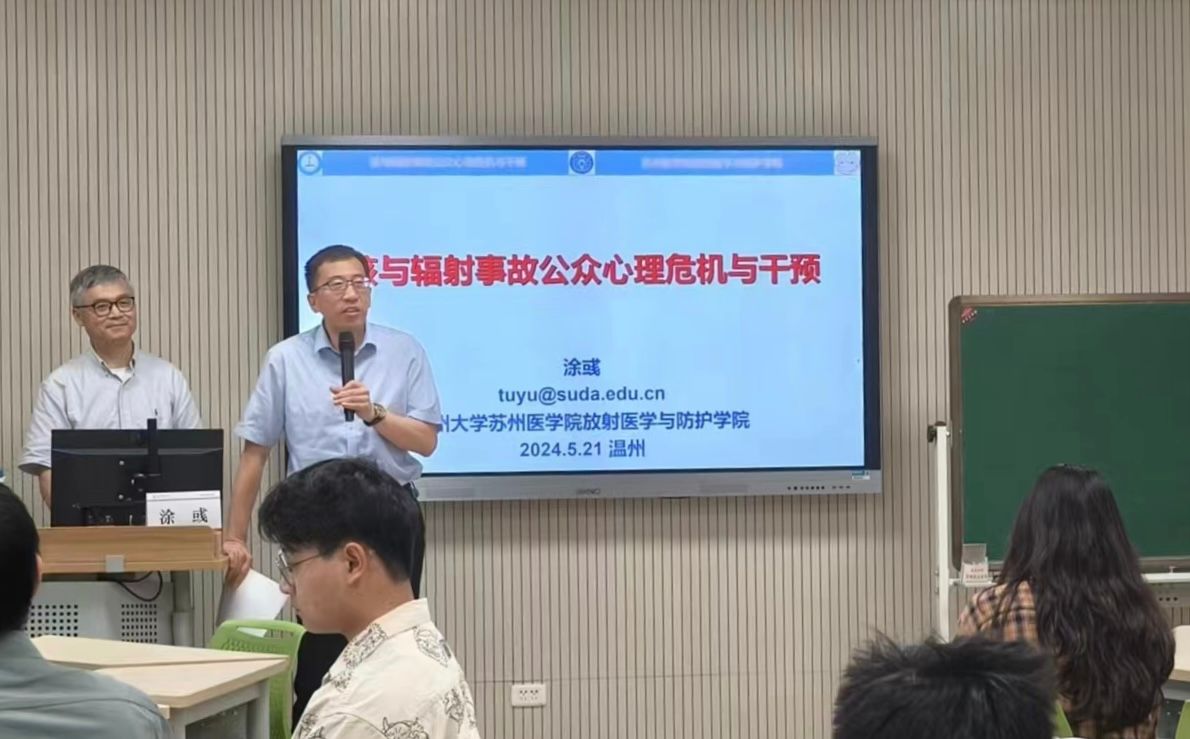 为加强师生对核与辐射事故公众心理危机与干预的认识,提升心理健康防护能力,杏吧 于5月21日下午在茶山校区成功举办了“大健康讲坛系列活动:核与辐射事故公众心理危机与干预”讲座。本次讲座邀请了知名专家苏州大学放射医学与防护学院涂彧教授担任主讲人,为学院师生带来了一场精彩纷呈的学术盛宴。马淑梅老师等教师代表以及本研学生代表参加,活动由杏吧 副院长刘佳明主持。