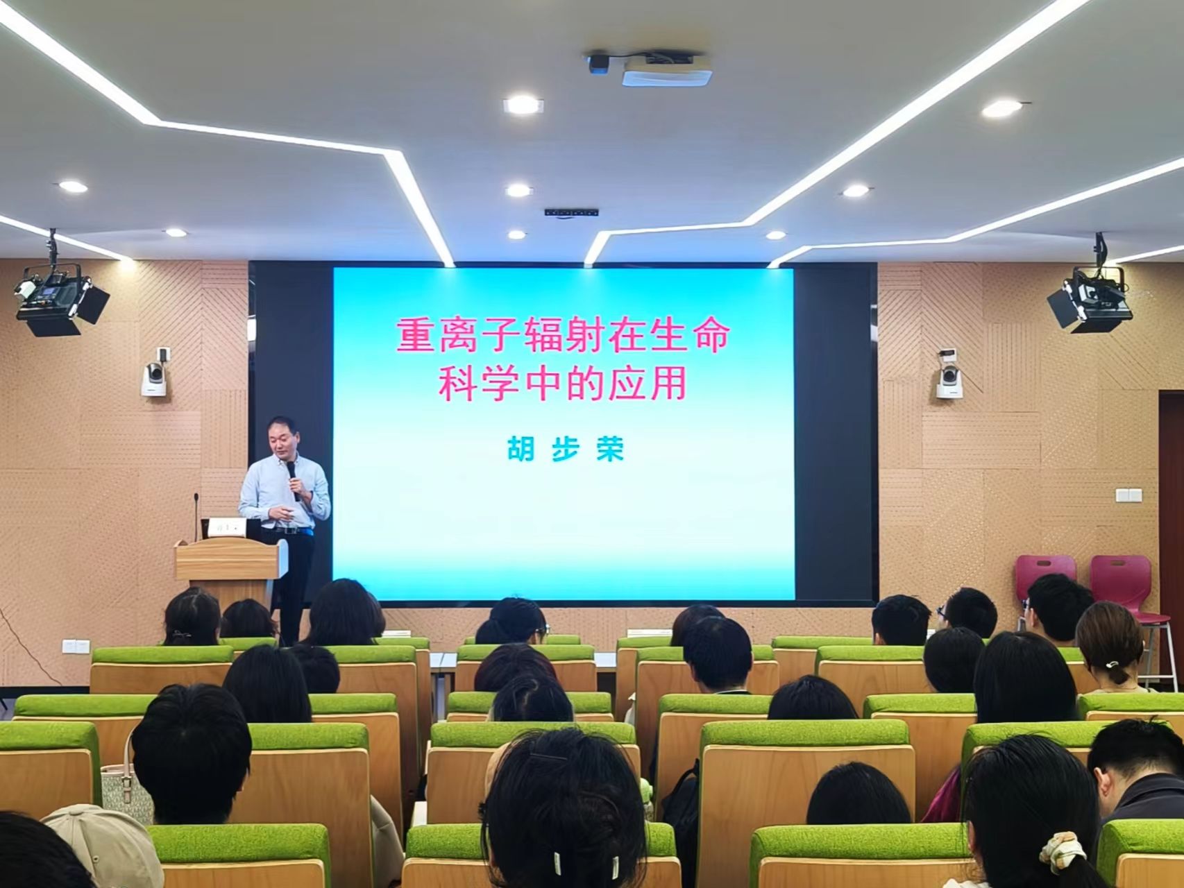 胡步荣研究员随后带来了“重离子辐射在生命科学中的应用”的专题讲座。胡步荣研究员详细介绍了重离子辐射的特点及其在生命科学领域的应用。他强调了重离子辐射在肿瘤治疗、辐射生物学研究等方面的独特优势,并分享了最新的研究成果。胡步荣研究员的演讲充满激情,使大家对重离子辐射的应用前景充满了期待。