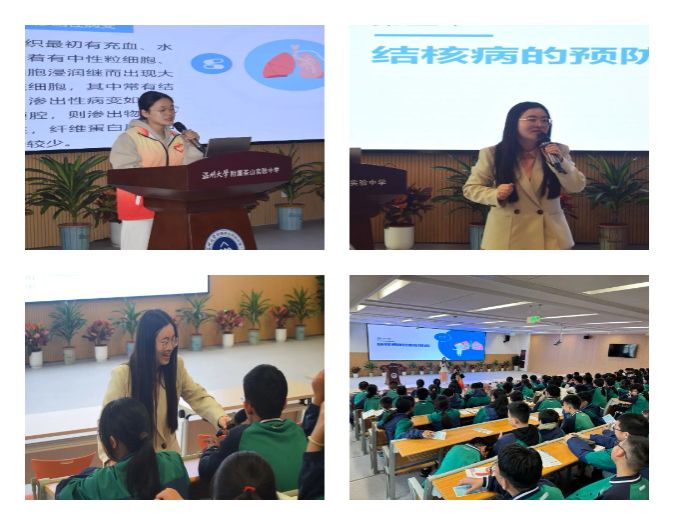 以第29个世界防治结核病日为契机,学院石芳老师和章红静同学为茶山实验中学近二百名师生做“预防肺结核科普知识”健康讲座,详细讲解结核病的基本知识、发病机制、治疗方法,普及疫苗接种的重要性,提高师生对结核病的认知和重视。此外,杏吧 各支部代表向在场的师生发放了健康宣讲手册,科普肺结核的相关知识。
