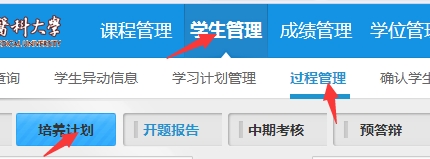 2.导师审核:完成的培养计划需提交导师审核,经导师、学院审核通过后,方可打印成书面版本,并且需要导师在纸质版的《研究生培养计划表》的导师栏进行手签后上交学院。导师登录系统后,进入学生管理——过程管理——培养计划,可查询学生填写的培养方案并进行审核,导师也可驳回学生的培养计划,经学生修改后再次提交审核。