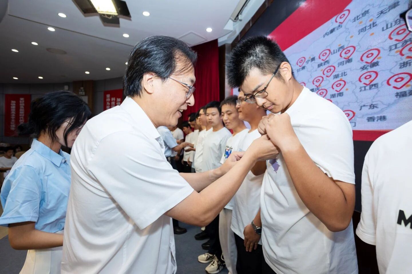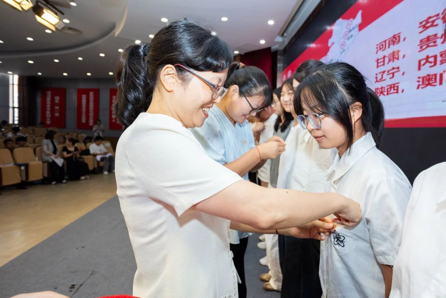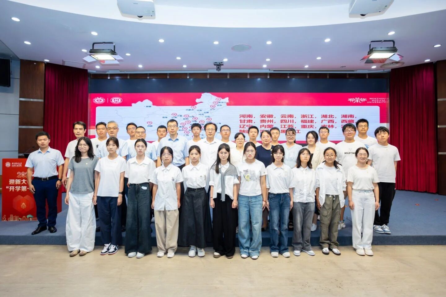 随后,来自天南地北的21位新生代表依次发言,乡音抒怀,壮志迎新;学院领导与导师们一同为他们佩戴院徽,寓意着五湖四海的学子汇聚于此,从此刻起,就是骄傲的温医人、公卫人。