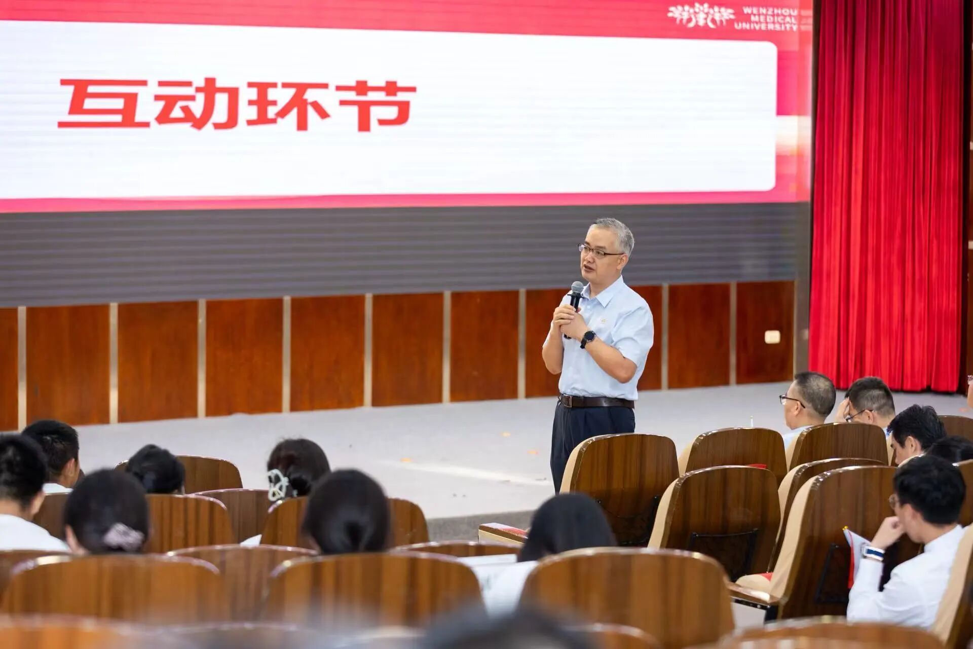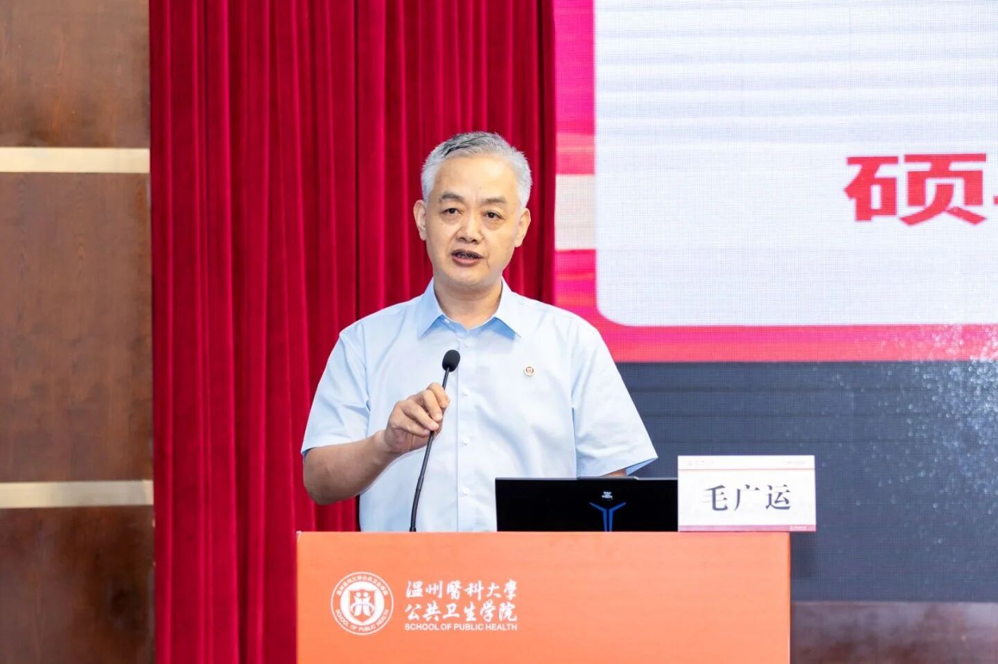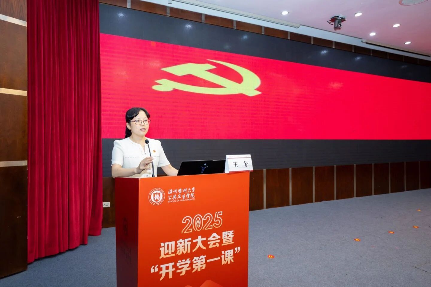 随后,来自天南地北的21位新生代表依次发言,乡音抒怀,壮志迎新;学院领导与导师们一同为他们佩戴院徽,寓意着五湖四海的学子汇聚于此,从此刻起,就是骄傲的温医人、公卫人。
