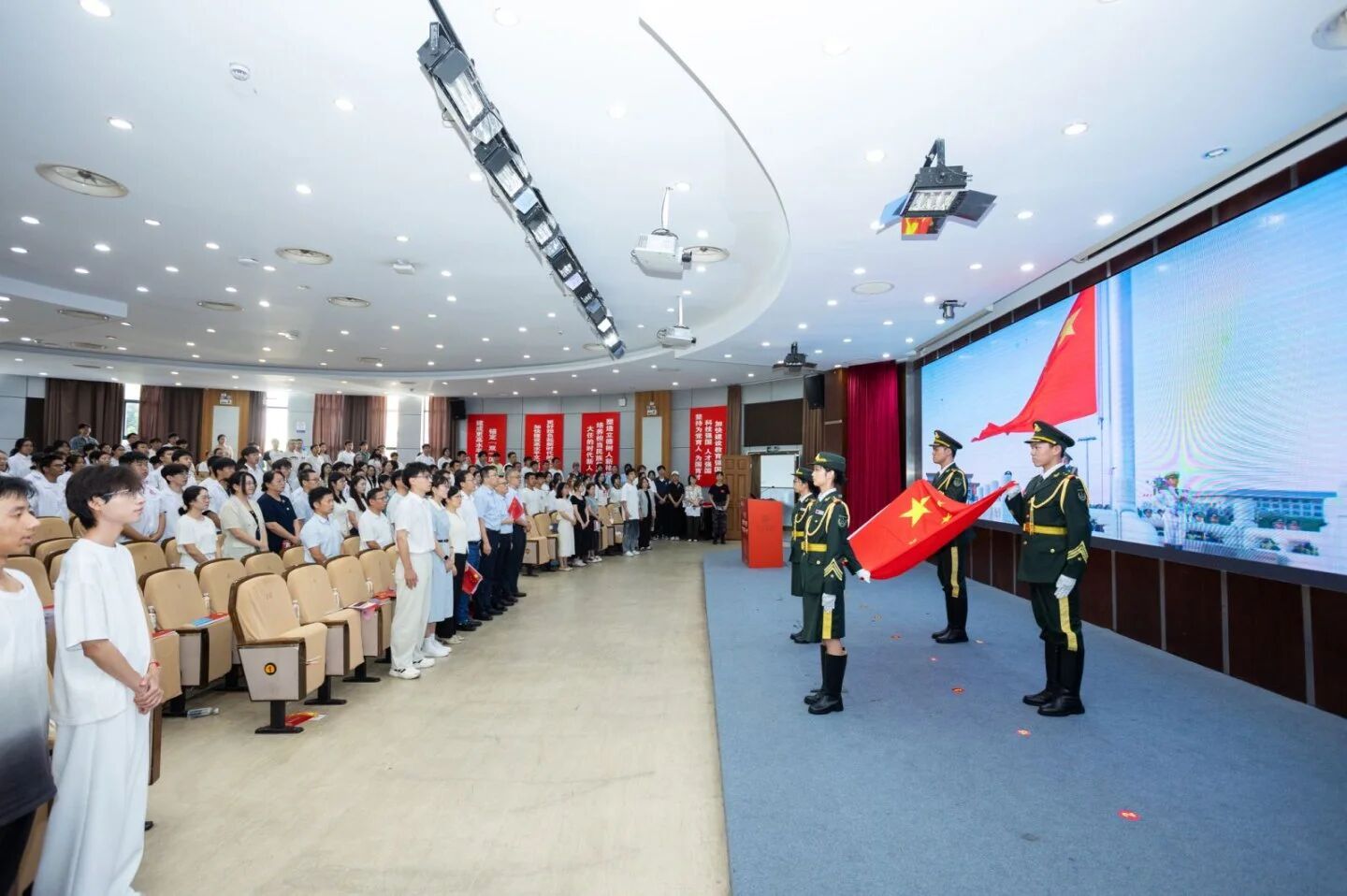 现场全体师生重温了振奋人心的九三阅兵仪式,并伴随国旗护卫队步入台前,共唱国歌,共同铭记国家发展的伟大成就,要将个人理想和强国建设紧密结合。